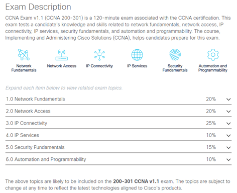 根据思科官方网站的信息所示,CCNA考试范围如下图: