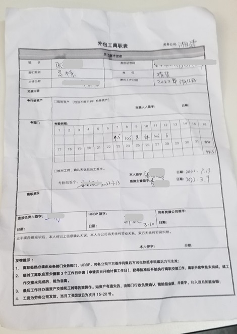 距离年假的结束也没有几个日子了,我向人力中介提出离职申请。按照手续,提出离职申请后我必须要再出勤3天,并且还要拿到分拣组主管和人力中介和淘菜菜考勤组主管合共三人的确认签名,方可确认离职,计算剩余工资。
