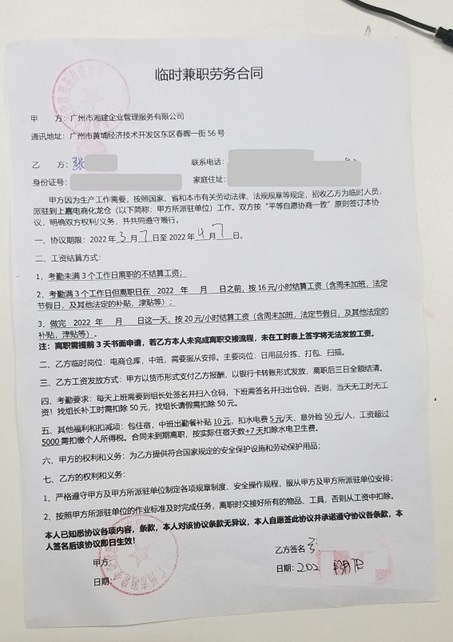 其实说是面试,实际到达后人力中介并没有问我来历过去之类长短三四的话题。只是拿出一沓劳务合同,分发给会客厅里连我在内的许多求职者,并特意说明了条款中关于工资的主要事项:做满3天才有20元的时薪,否则按16/时结算。