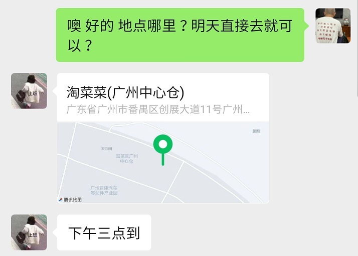 说做就做。在招聘app搜索一番,最后选择了时薪相较其他日结兼职都高,且包住宿的「淘菜菜仓库分拣员」,添加了人力中介的微信,相约面试地点与时间。