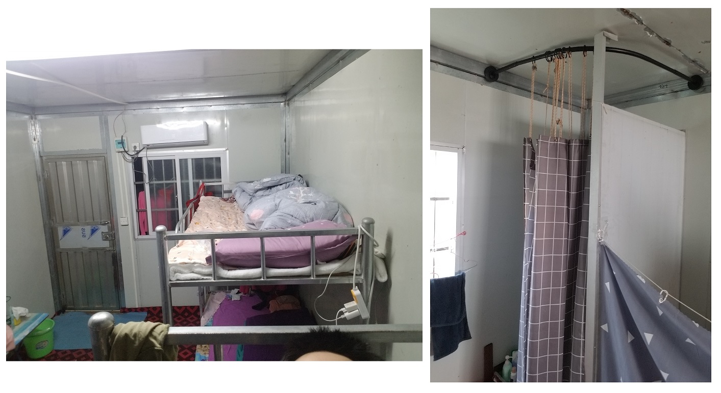 - 直到凌晨01:30-02:00,系统的任务全部分派完成后,就可以下班回宿舍休息了。宿舍的样式是工地上常见的集装箱房,一个单间有三个上下铺高架床可住6人,内还架设有一个厕所和沐浴在一起的简易卫生间和一台空调。除了扣除5元/天的水电费外,并无其他费用。