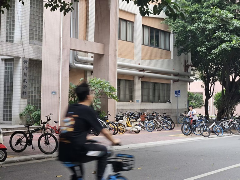 邑大是共享单车友善大学。无论是在宿舍楼下,还是教学楼旁,都能看到有序停放的共享单车。我解锁了一辆哈啰单车,代步以游校园。