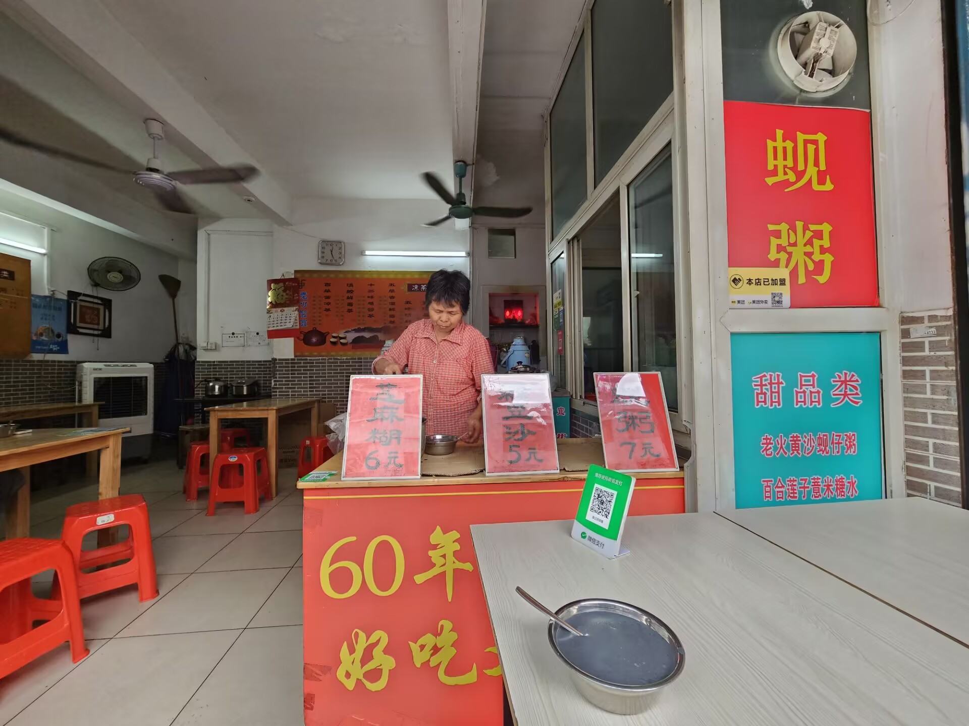 街上有一家名为泉记凉茶铺的老字号 ,以芝麻糊和蚬粥而闻名。虽然起了想要尝试蚬粥的念头,可是我既不喜欢喝热粥,也对海鲜不感冒,并且接下来还有其他想吃的。所以短暂思考后,还是决定只要一碗芝麻糊。