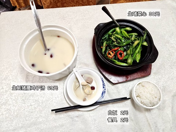 翻开菜单,发现列出的菜品并不多,但都是具有代表性的广府菜,例如“生啫煲”、“走地鸡”、“酿乳鸽”等等。斟酌再三,我最后敲定了两道菜,分别是三宝汤(中)和生啫菜心,外加一碗白米饭。