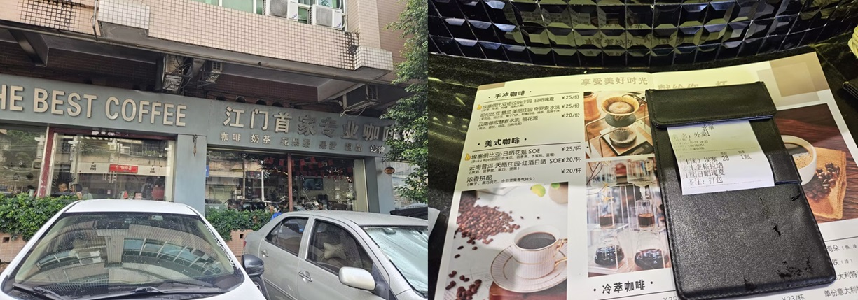 转着转着,忽然被一家招牌老派的咖啡厅吸引了目光,「江门首家」?好大的口气!毕竟作为中国侨都,早在19世纪60年代,海外华侨华人就已经将咖啡文化带到了这里。时至今天,这个城市也早已成为内地最大的咖啡豆烘培生产基地之一。在好奇心驱使下,我那刚歇息的食欲被再次「激活」,等回过神来,双脚已经走进店里。「手冲冷萃」、「瑰夏花魁」、「拼配特调」……作了几番思想挣扎,我下单埃塞俄比亚日晒瑰夏冰滴咖啡,外带拿走。