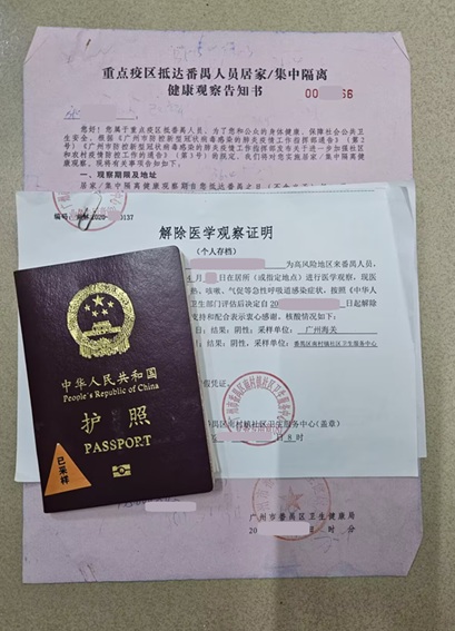 转变出勤模式之后,我申请年假购买机票,准备回母国享用假期并开始远程工作的过渡与适应。相较于日本,国内的防控工作相当成熟。当我乘坐国际航班抵达广州白云机场后,一路上都有“大白”专线指引,测温采样。从航站楼出来后,便随隔离大巴和其他旅客一起被统一接送至隔离酒店。