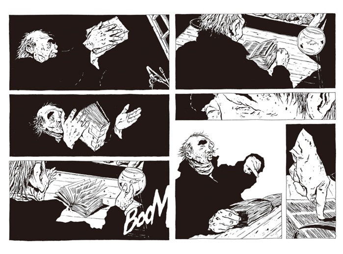 和过往主流的漫画有些不一样的是,这部作品鲜有台词,在近乎无言的镜头中,作者用其特有的节奏,讲述了一个寂寞的故事:天生畸形的他自出生就被父母遗弃在一个与世隔绝的小岛灯塔里,他的父亲临去世前支付给相熟的水手一笔钱,托付他每周给自己的弃儿运送食物等生存物资。就这么一晃五十年过去了,在这方寸地之上他全赖一条金鱼、一本字典和一些海上飘来物作伴,用天马行空的奇思妙想,想象孤岛之外的生活。